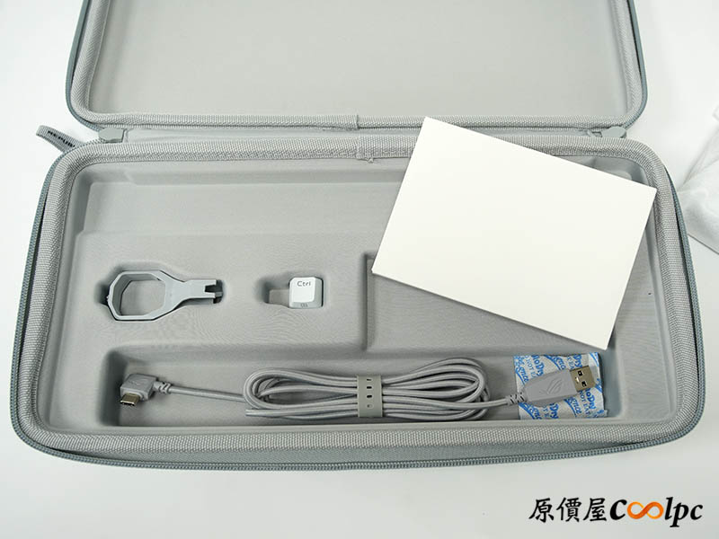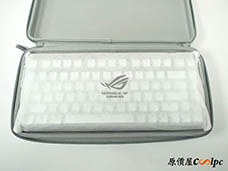 (點圖放大)內附的硬質便攜保護包質感很不錯,外層用的是滑順的佳績布材質;這裡有個小細節,黑色款附的是黑色包,而我們這次開箱的白色款則是搭配淺灰色唷!打開包包後,會看到鍵盤本體還有用布質收納袋保護著,這保護做得很夠!底下則是有針對拔軸器、連接線與說明書設計的專屬收納槽,不管是出國比賽還是去朋友家網聚,直接一包帶走就搞定,對有外出需求的朋友來說非常方便。