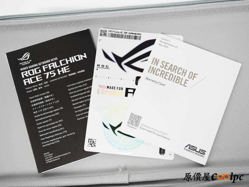 (點圖放大)這次開箱的是白色 ROG Falchion Ace 75 HE HFX V2 磁軸的版本!外盒依舊是 ROG 標誌性的紅黑配與經典圖騰,中間放了產品彩色示意圖,右上角的產品名稱則是用金屬質感印刷。右下角直接標出這把鍵盤的重點:包括原廠預潤軸、PBT 鍵帽,以及最核心的 ROG HFX V2 磁軸,當然也標明了是繁體中文配置。盒裝側面印了不少職業戰隊的標誌,這代表它是真的陪著許多選手拿下過勝利,是真正的電競神器!