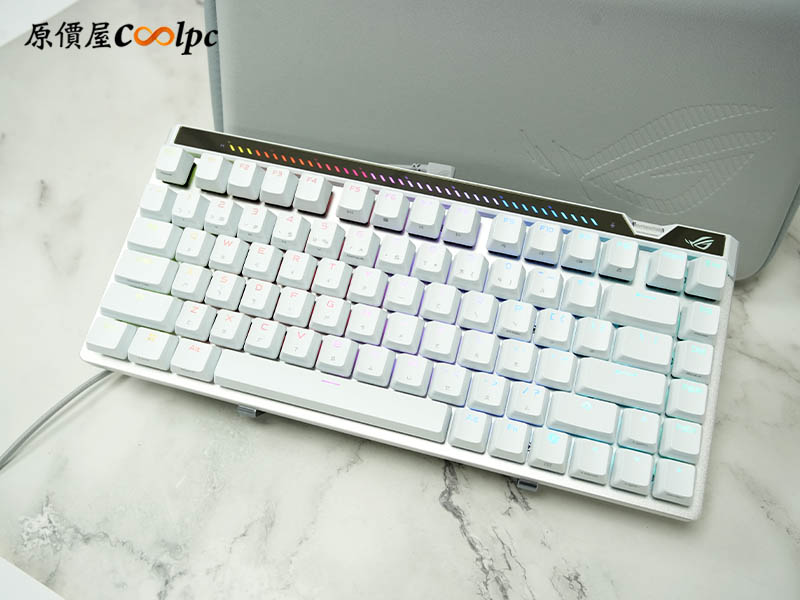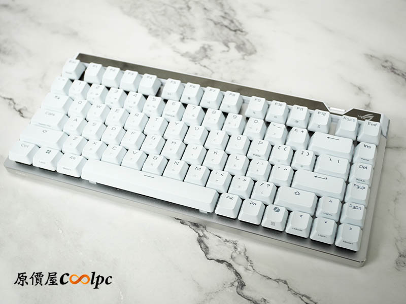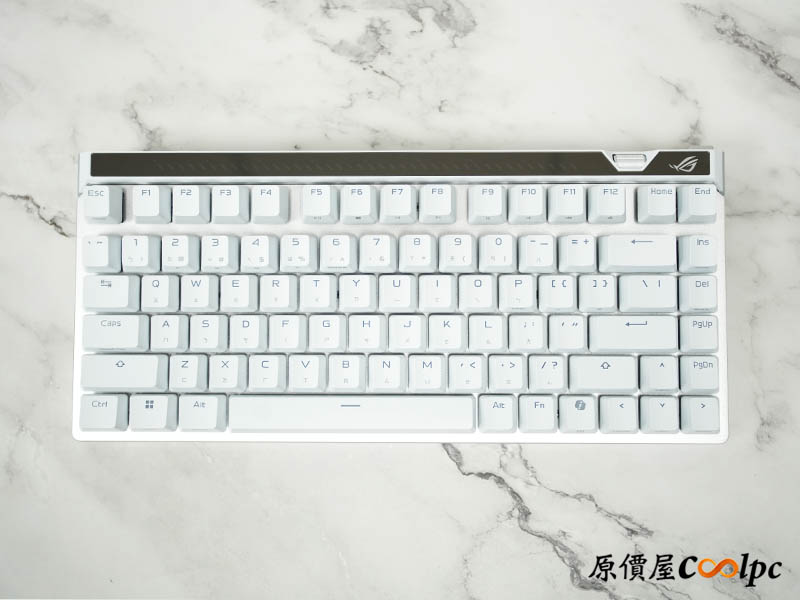 ASUS ROG Falchion Ace 75 HE 採用 75% 配列設計,最上方的 F 功能鍵做了微幅區隔,而方向鍵與功能鍵則緊湊地整合在字母區旁。這樣的配置讓整體視覺非常整齊洗鍊,不過對於習慣全尺寸或 80% 鍵盤的玩家來說,第一次上手可能需要稍微適應一下。頂部那一條醒目的鏡面裝飾可不只是為了好看,它其實隱藏了實用的顯示功能,這部分我們留到後面再詳細揭曉!