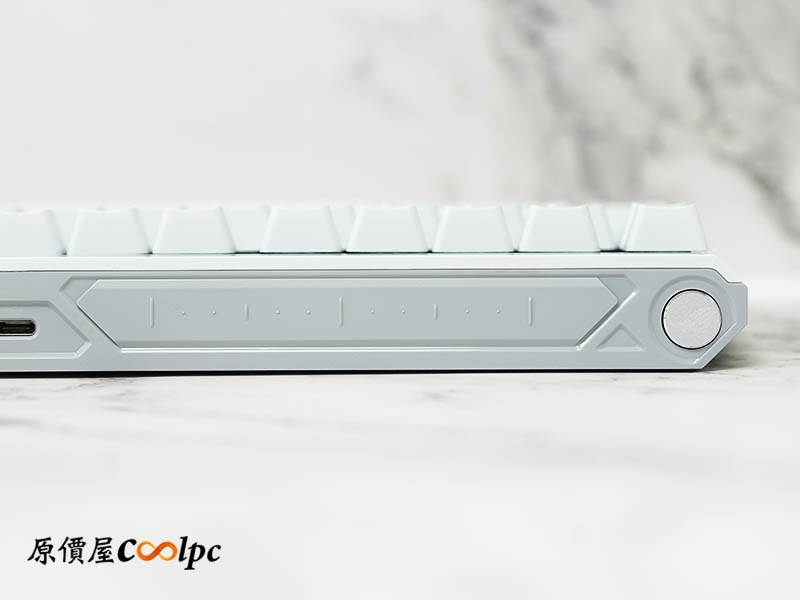 首先看到左上角的多功能切換鍵與帶有刻度的觸控條,功能涵蓋了系統音量、媒體曲目切換以及 RGB 燈效亮度調整,切換時也都會亮起對應的燈號;最後一個 M 檔位則支援全自定義,原廠預設是滑鼠滾輪功能,拿來滑網頁意外地順手!如果想要更進階的玩法,玩家也能透過網頁版驅動 Gear Link 進行深度自訂唷。