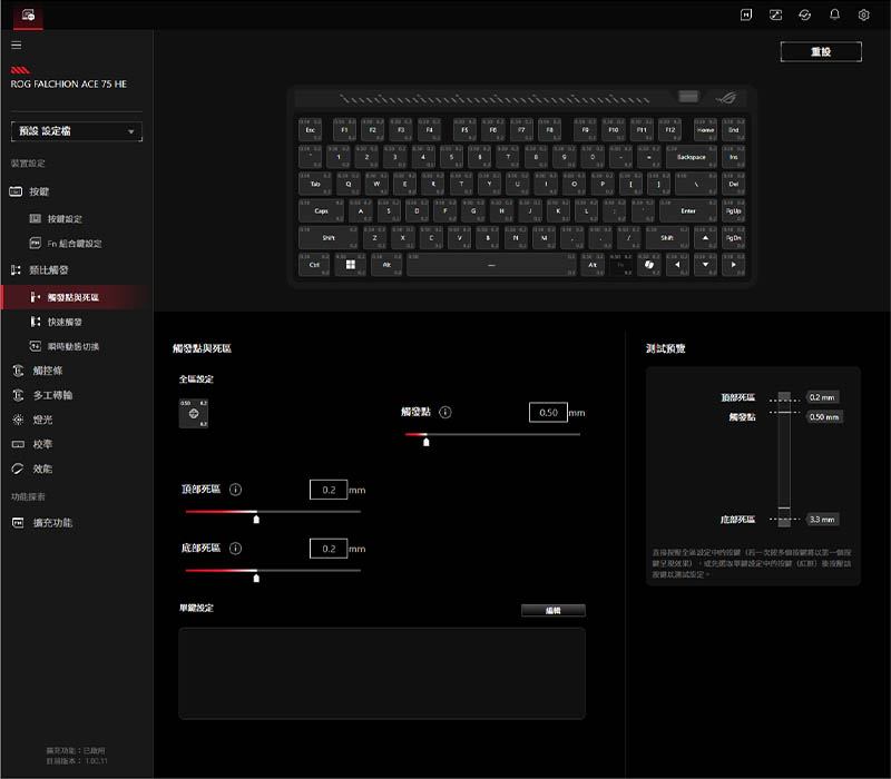 (點圖放大)類比觸發分頁是整把磁軸鍵盤的核心命脈,也是玩家們最關心的重頭戲。這裡包含三大核心功能:觸發點與死區、快速觸發 (Rapid Trigger) 以及順時動態切換 (Speed Tap)。憑藉著 0.01mm 級的極致微調精度,你可以在 0.1~3.5mm 範圍內依照個人手感與遊戲需求自由設定。看是要追求極速發動,還是要紮實的反饋感,這把鍵盤的極高自由度,就交給各位玩家去盡情發揮了!