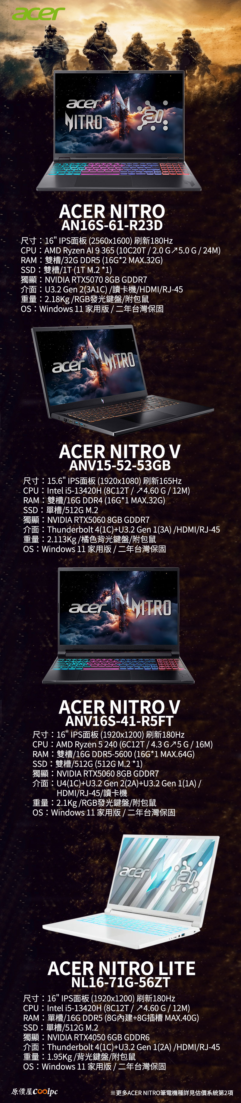ACER NITRO目前還能細分成NITRO、NITRO V、NITRO LITE三種系列,第一種NITRO系列是經典電競款,像目前我們有販售的AN16S-61-R23D,搭載AMD Ryzen AI 365處理器和NVIDIA GeForce RTX5070筆記型顯示卡,16吋還有厚度不到19.9mm的薄型機身,可以說是結合強大AI效能和靈巧的便攜性。ACER NITRO V效能與NITRO接近,無論Intel、AMD平台,尺寸也是14″、15.6″、16″都有,例如15吋的NITRO V ANV15-52-53GB就是Intel i5-13420H處理器搭RTX5060;16吋的ANV16S-41-R5FT有AMD Ryzen 5 240處理器配RTX5060,款式等級相對多元,玩家們的選擇更豐富。最後NITRO LITE顧名思義是輕量化,主打時尚與便攜性,像是NITRO LITE NL16-71G-56ZT就只有1.9KG,16″極輕薄設計,使用Intel i5-13420H處理器與RTX4050顯卡,真要說效能也有一定水準。