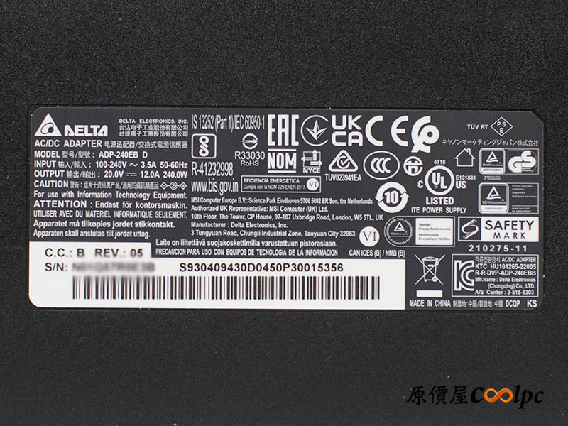 變壓器為台達的 ADP-240EB D,輸出最大 20V、12A、240W,體積略大,但是可以輕鬆收在背包裡的大小。