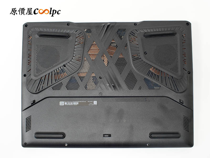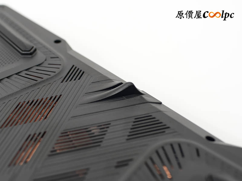 底部採用大量開孔設計,渦輪造型直接對準雙風扇,甚至能看到內部的散熱銅管。四周腳墊刻意加高,不僅防滑,更確保了充足的進氣空間。