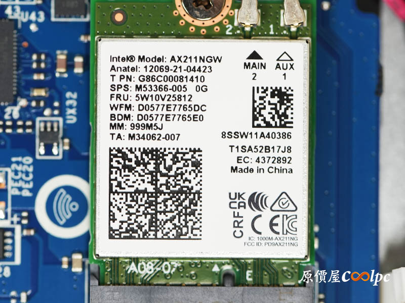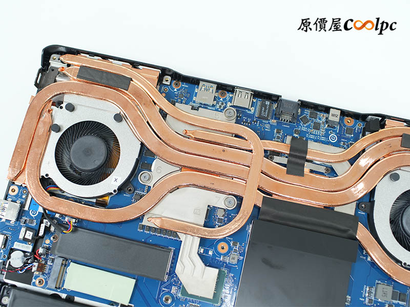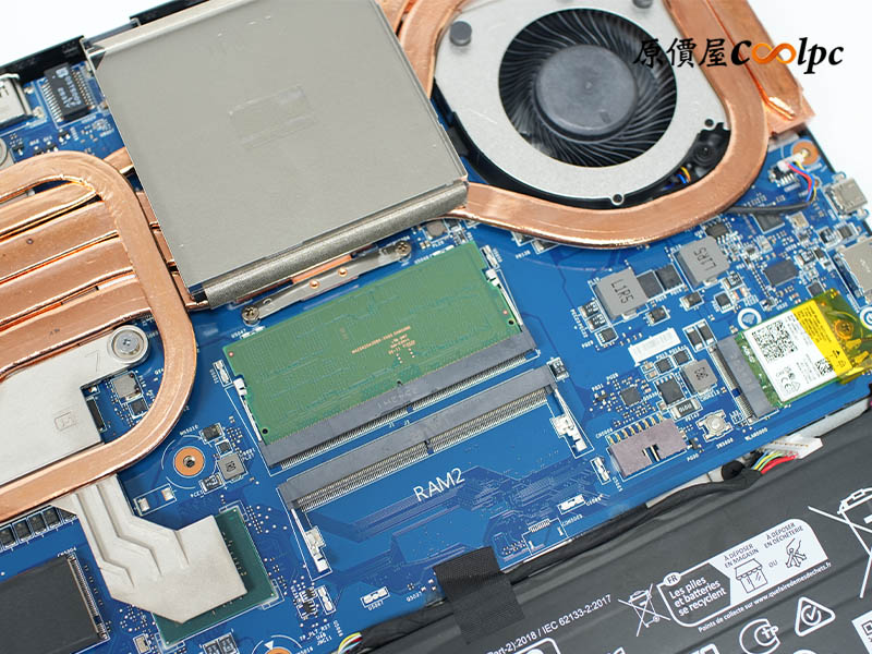 拆開 D 蓋後,映入眼簾的是非常有誠意的散熱佈局,這套 Cooler Boost 5 系統利用雙風扇搭配 5 根粗細不同的導管,能迅速將廢熱傳導至 4 個方向的散熱孔排出。而在黑蓋保護下的記憶體區,內建了一條三星 16GB DDR5-5600 記憶體,雙插槽最高可擴充到 96GB。儲存空間則由美光 1TB Gen4 SSD 坐鎮,旁邊還預留了一個 M.2 槽位供你隨時升級。至於連線與續航,則由支援 Wi-Fi 6E 的 AX211 網卡及 90Wh 大容量電池扛起重任,整體內部配置平衡且充滿戰力!