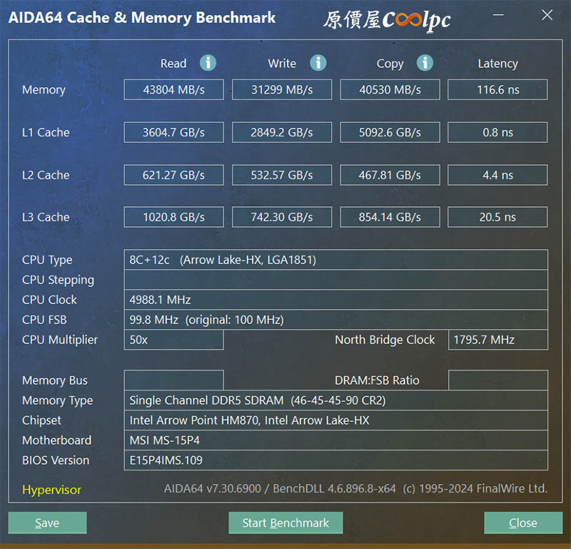 AIDA64 Cache & Benchmark 分數,Read 43804 MB/s、Write 31299 MB/s、Copy 40530 MB/s、Latency 116.6 ns。