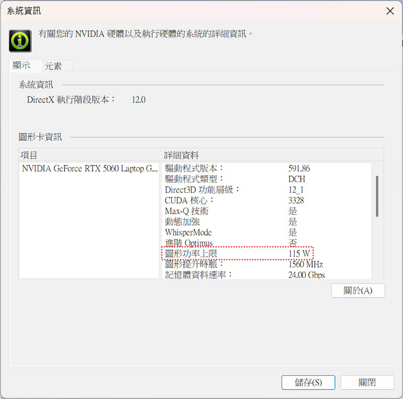 RTX 5060 Laptop GPU 硬體詳細資訊,顯卡功率上限 115W。