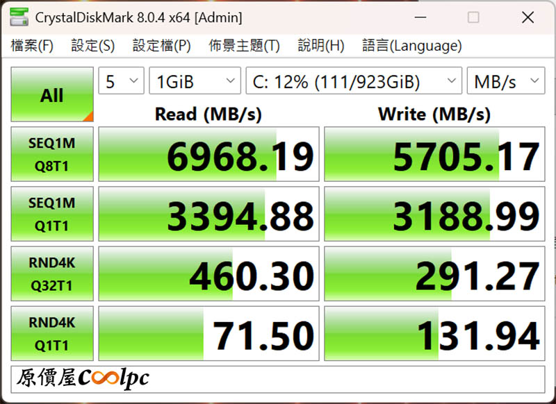 CrystalDiskMark 硬碟速度測試,最高隨機讀寫速度為 6968.19/5705.17 MB/s。