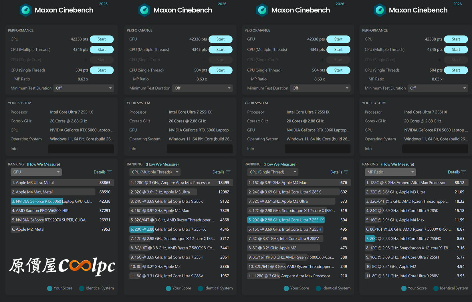 最新 Cinebench 2026 測試分數,GPU 綜合測試 42338 pts、CPU多核心 4345 pts、CPU單核心 504 pts。
