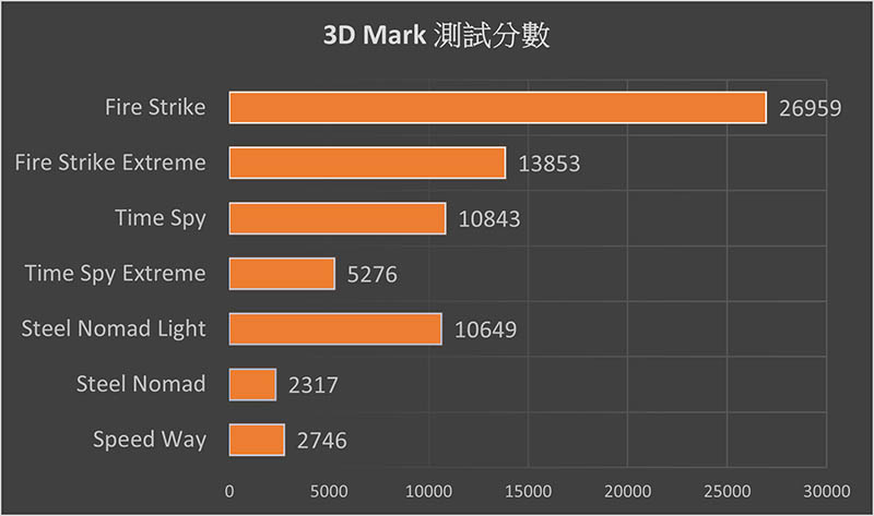 在 3D MARK 各項測試中,基於 DirectX 11 FHD 畫質的 Fire Strike 獲得 26959 分,2K 畫質的 Fire Strike Extreme 則是 13853, Time Spy 是 10843,Time Spy Extreme 則是 5276;針對主流遊戲效能測試的 Steel Nomad 與 Steel Nomad Light 分別獲得 10649 與 52776,效能要求比較高的 Speed Way 測試則是獲得 2746,整體測試和之前開箱的 2K 螢幕 + RTX 5070Ti 規格的筆電相差約 5% 左右的跑分,一般使用很難體感出差距。