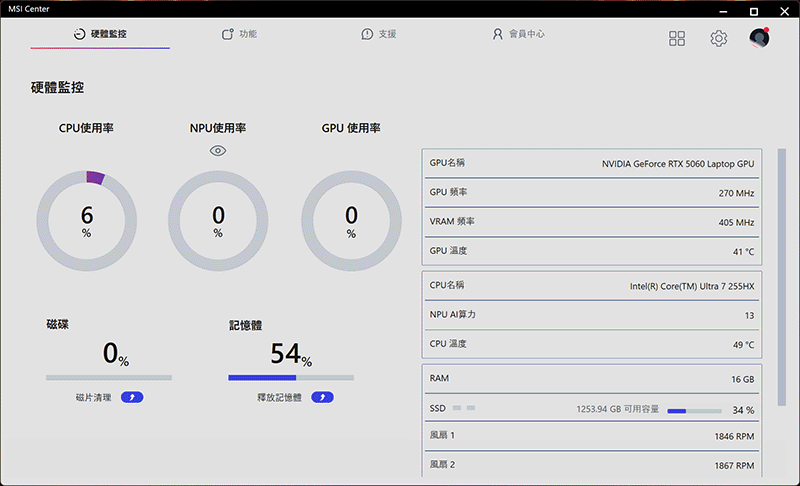 這台筆電內建了 MSI Center,讓你可以隨手客製化各種系統設定。裡面除了可以隨時監控硬體狀況,還有針對不同情境預設好的模式可以切換,當然大家最愛的 RGB 燈效也是在這邊調整。如果想當個省心玩家,記得把 MSI AI 智慧引擎打開。它會根據你當下的使用狀況,自動判斷並調整效能,不用自己動手點來點去,電腦就能隨時保持在最佳狀態,真的非常方便!