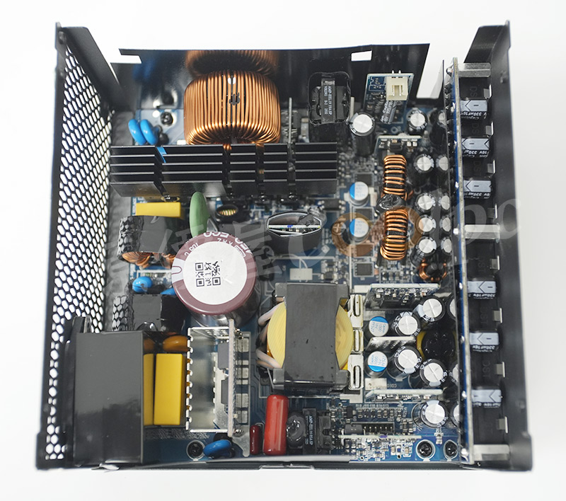 直接看模組化輸出端這邊,插槽功能都有標示加上防呆設計,看得出來12V-2×6有預留一個插槽空間,但猜測是因為這顆LEADEX III最多就850W輸出,多做也不會真的讓總輸出上升,看來只有更大瓦數的版本有機會用上它了。