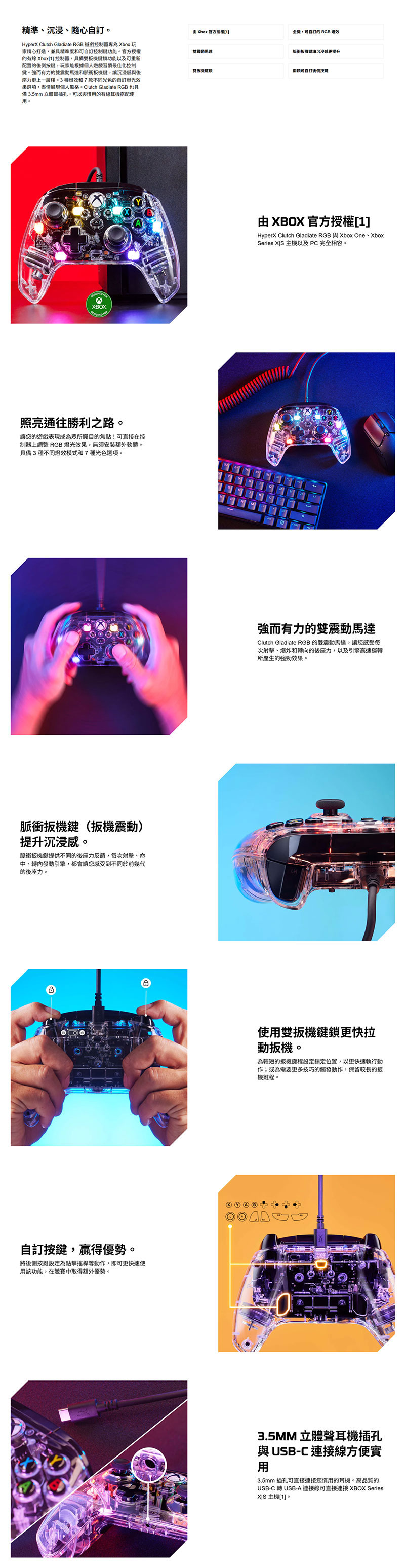 先來看聲音擔當「HyperX DuoCast USB 麥克風」。它不走浮誇路線,而是那種一插上就知道「喔,這聲音不一樣」的實力派!24-bit / 96kHz 高解析錄音,講話清楚、細節到位,不管是直播還是聊天、遊戲語音還是臨時想錄個影片、Podcast,都能直接上場。RGB 燈效不是為了炫,而是讓桌面看起來更有專業玩家+創作者的氛圍。頂部一鍵靜音設計,咳嗽、喝水、家人突然進房,手一碰就安靜,直播救星無誤。再加上內建防震結構,鍵盤敲再大力,也不會把整桌的情緒都收進去~接著是操作核心「HyperX Clutch Gladiate Xbox 搖桿」。如果你玩的是動作、競速、射擊或模擬類遊戲,那搖桿真的會讓體驗完全升級。符合 Xbox 官方配置的按鍵布局,上手零學習成本,插上 PC 就能用!握把設計紮實,長時間遊玩手不酸,回饋感明確,每一次按壓都很有感覺。讓玩電腦遊戲不再只是滑鼠鍵盤的專利!