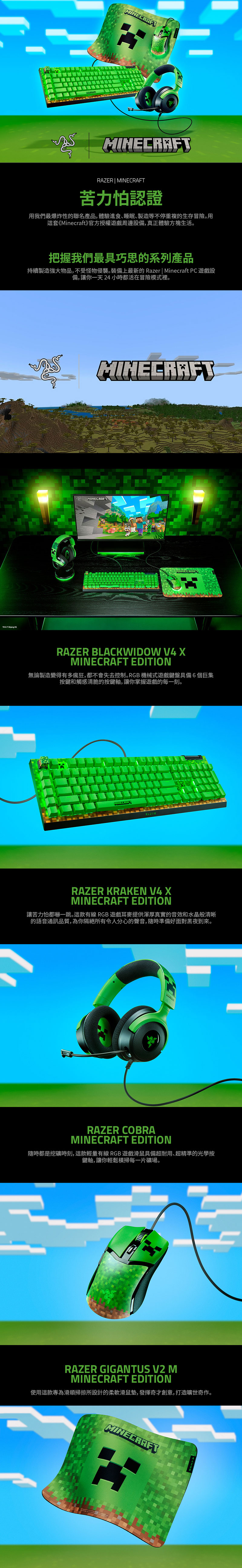 這次的組合內容一次看!「RAZER X Minecraft 限定版電競組合包」內容包含鍵盤、滑鼠、鼠墊、耳機,能滿足想要一次擁有所有戰力的玩家朋友!「Razer BlackWidow V4 X Minecraft 限定版鍵盤」具備熟悉的 RAZER 手感,配上 Minecraft 經典像素設計,打字、操作都穩到不行~清脆回饋讓每一次輸入都像敲中鑽石礦一樣,遊戲與日常使用都超有感!「Razer Cobra Minecraft 聯名滑鼠」輕巧好操控,高精準感應器讓你在 PvP、建築微調時都能精準到位!像素外觀不只好看,實戰更是可靠夥伴呢~「Razer Gigantus Minecraft 限定版鼠墊」更是擁有大面積滑順表面,穩定追蹤不卡頓,不管是高速轉向還是精細移動,都能順暢發揮,讓操作像紅石電路一樣的流暢!最後再來一支「Razer Kraken V4 X Minecraft 限定版耳機」,沉浸式音效讓你聽見怪物腳步、爆炸方向與環境細節,戴上它,晚上下礦也不怕苦力怕突然來訪啊~所以準備好了嗎?現在就把這套「RAZER Minecraft 限定版電競組合包」帶回家,讓你的每一次開箱,都是傳說級掉寶!