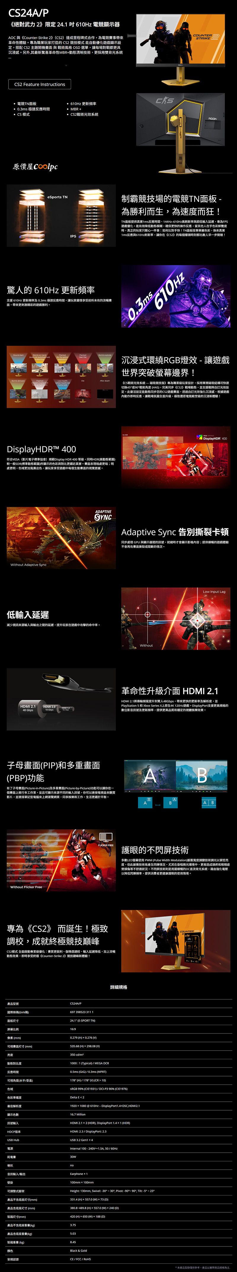 AOC CS24A/P〈2H1P/TN/610Hz/HDR400/HDMI2.1〉《絕對武力 2》聯名款 ,$21999↘$19999