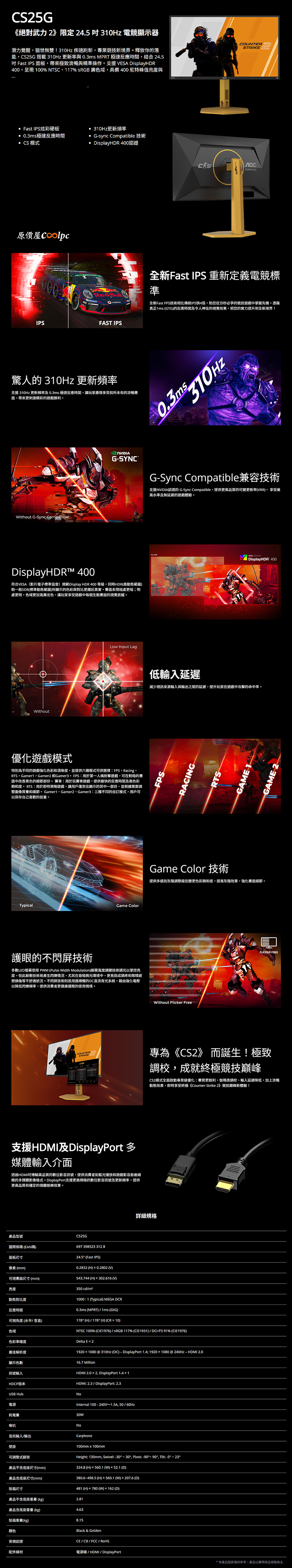 AOC CS24A/P、CS25G有著專屬CS2模式,全面啟動專業級優化,不僅畫質更銳利,伽瑪值精心調校、輸入延遲降低,動態效果都流暢無阻,還有CS2主題開機畫面、戰術風格OSD選單,就連外型設計也有CS2風格元素塗裝,黑金配色展現尊爵不凡的氣場。在規格方面AOC CS24A/P擁有最適合FPS遊戲的24.1吋螢幕,並特別選用速度最快的TN面板,在FHD解析度下帶來高達610Hz刷新率,0.3ms極速反應時間(MPRT),還支援MBR+動態清晰技術、VESA DisplayHDR 400高動態、Adaptive Sync抗撕裂等、PIP子母/PBP多重畫面功能、護眼不閃屏技術,I/O也搭載2x HDMI 2.1、1x DisplayPort 1.4、4x USB3.2 Gen1 Type-A、耳機孔等各式連接埠。更特別的是內建CS戰術光效系統,同步CS2戰場動態,透過光效強化沉浸感,遊戲氛圍全面升級。CS25G則是24.5吋 FHD Fast IPS面板,310Hz疾速刷新率,0.3ms反應時間(MPRT),支援NVIDIA G-Sync Compatible、VRR可變更新率,通過VESA DisplayHDR 400認證,針對不同遊戲提供優化的顯示設定檔,Game Color技術強化畫面細節,不閃屏技術也沒少,I/O配備2x HDMI 2.0、DisplayPort 1.4、耳機孔。