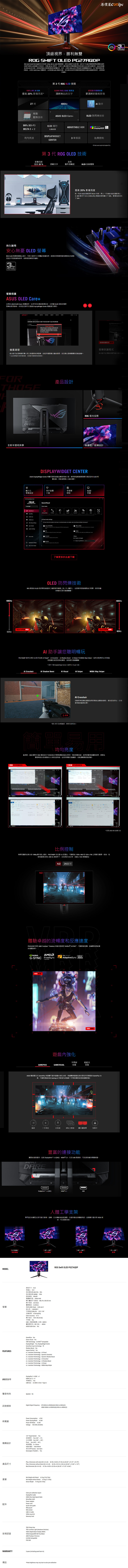 ROG SWIFT PG27AQDP是全球首款具備1440p 480Hz的OLED螢幕,搭載第3代ROG OLED技術、0.03ms疾速反應時間(GTG)、ELMB超低動作模糊技術,專為動作冒險3A級大作遊戲而生!還有99% DCI-P3色域覆蓋、VESA DisplayHDR TRUE BLACK 400讓畫面更生動逼真,遊戲中有AI Crosshair、AI Shadow Boost、AI Visual、AI Sniper、MOBA Map Helper等輔助功能,讓你輕鬆獲得勝利。螢幕還特別採用半透明美學,附帶ROG投射燈設計,I/O提供2x HDMI 2.1、1x DisplayPort 1.4、2x USB3.2 Gen1(2A)、1x 耳機插孔等。ROG SWIFT PG32UCDMR則是具備4K UHD(3840 x 2160)、240Hz刷新率、0.03ms反應時間(GTG)、HDR10、Dolby Vision,並通過DisplayHDR TRUE BLACK 400認證,3A遊戲&4K大型影音編輯都能滿足。遊戲還能透過AI準心、AI Shadow Boost、AI VISION輔助提升體驗,或是將畫面調整成24.5″、27″遊玩。螢幕本身走CYBERPUNK美學風格,有ROG氣氛投射燈,I/O配備目前最新最快的DisplayPort 2.1(80Gbps)輸入,還有2x HDMI2.1、1x USB-C(DP Alt Mode)、3x USB3.2 Gen1 Type-A、1x 3.5mm耳機孔,各式功能都應有盡有。