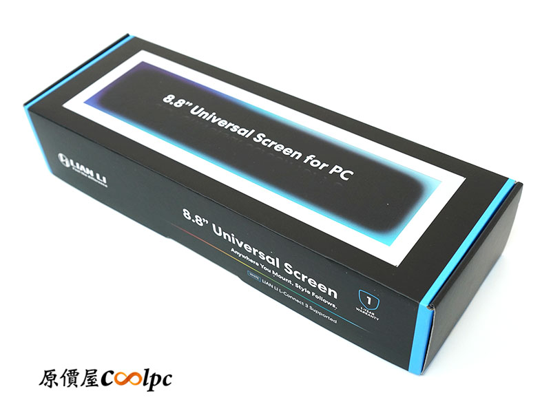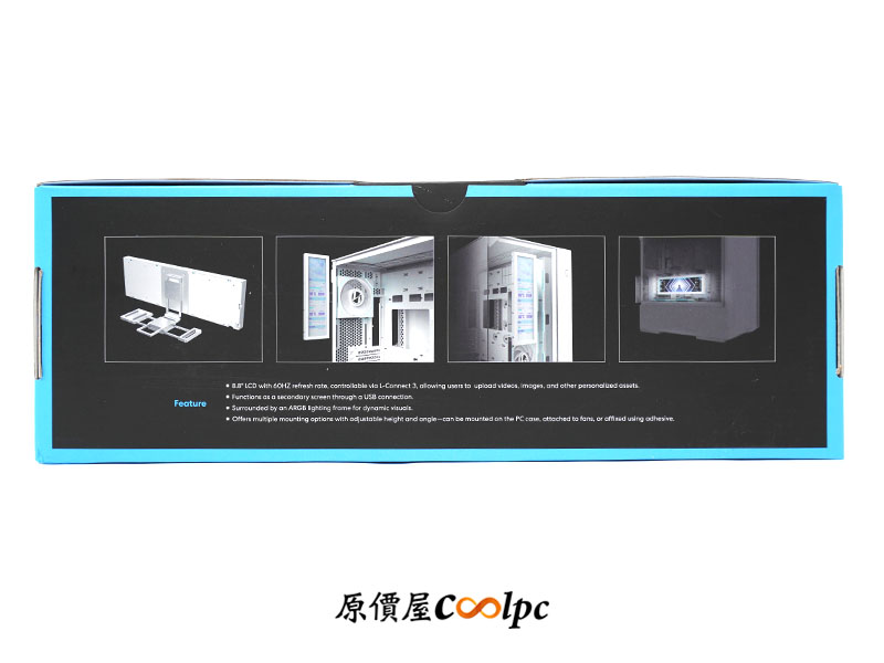 包裝底部標示更多細節特色,但好像不構詳盡,不過小編這邊詳細一點的說。聯力 8.8 吋通用螢幕採用 IPS 面板,提供 1920×480 解析度、60Hz 更新率、500 尼特、ARGB 燈光內邊框,軟體支援 L-CONNECT 3 控制,可以上傳 MP4、GIF、JPG 或 PNG 格式的內容,除了可以自訂主題外,更可以套用內建模板來做質感滿分的硬體偵測螢幕,對入門或是懶得折騰的玩家非常友善!