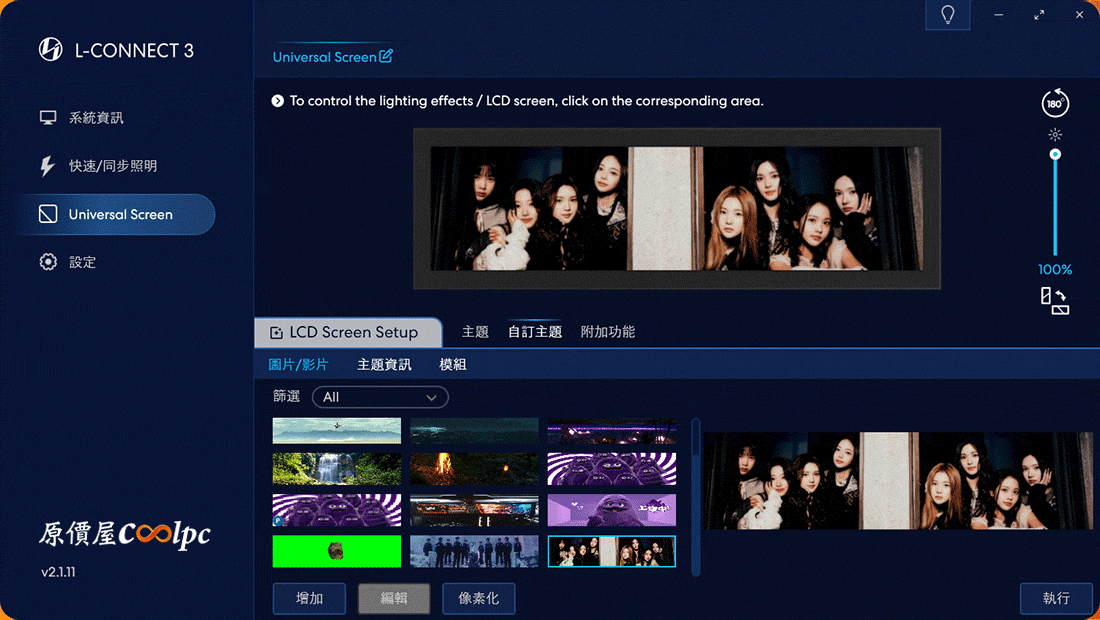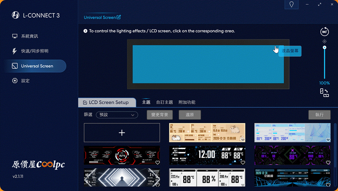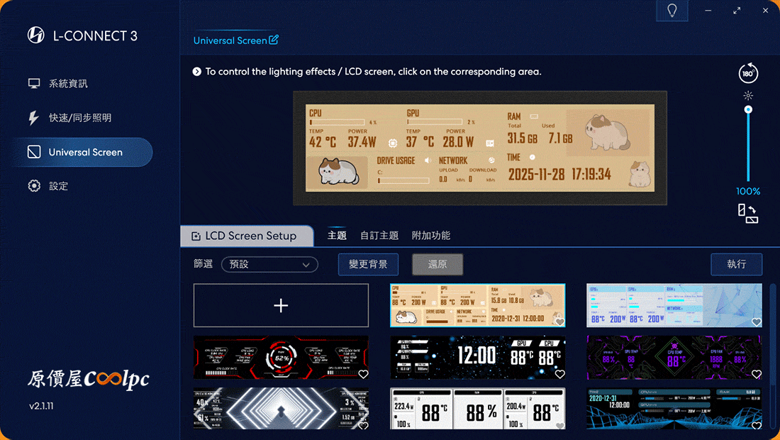 進入 L-Connect 3 軟體內的 Universal Screen 選項中,你可以看到內建多種預設主題,包括硬體監控(即時顯示 CPU/GPU 溫度、負載)、時鐘、甚至貓咪動態圖!看似複雜但它直接給你已經設計好的主題讓用戶直接套用,橫向、直向專用版本都備妥了。點上方的 ARGB LED 邊框或液晶螢幕區塊,可直接選定要調整的功能。右側還能調整螢幕亮度、螢幕垂直/橫向、螢幕 180° 旋轉,整體操作非常直覺!
