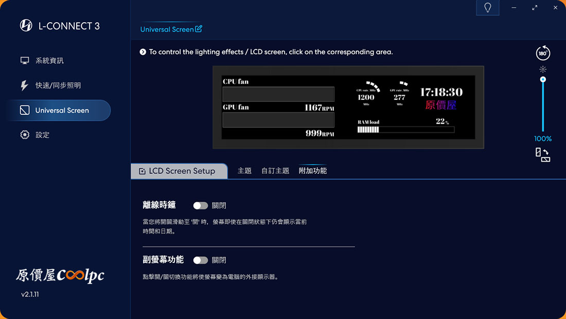比較特別的是透過聯力自家軟體 L-CONNECT 3,可以調整當主機關閉時,聯力螢幕自動切換成離線模式時鐘,時鐘除了顯示時間、日期,還有 LIAN LI logo。
