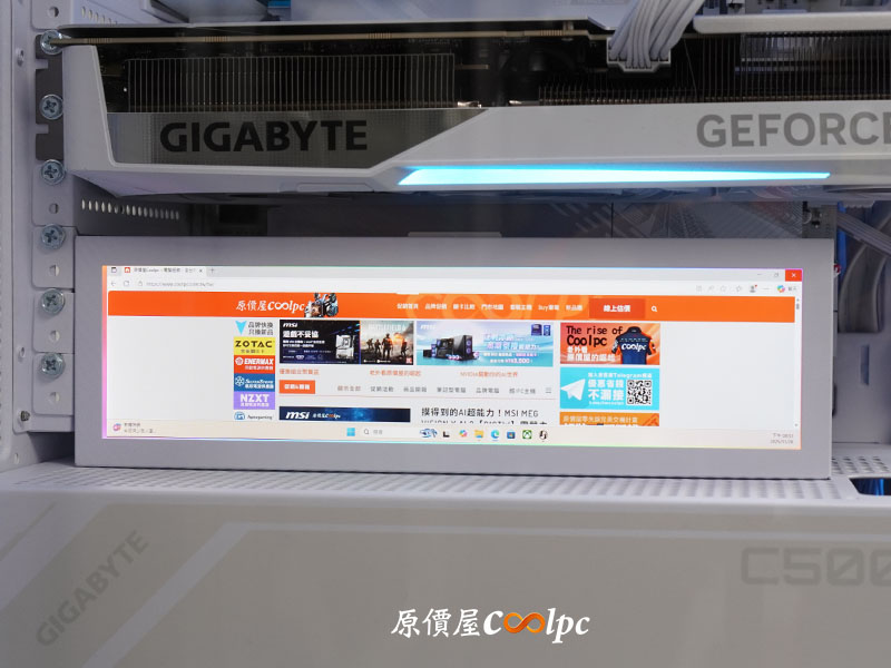 聯力 8.8 吋通用螢幕應用情境之一,利用機殼上方水冷風扇的位置,也因為支架的鉸鏈和滑軌設計,讓角度調整更多變。