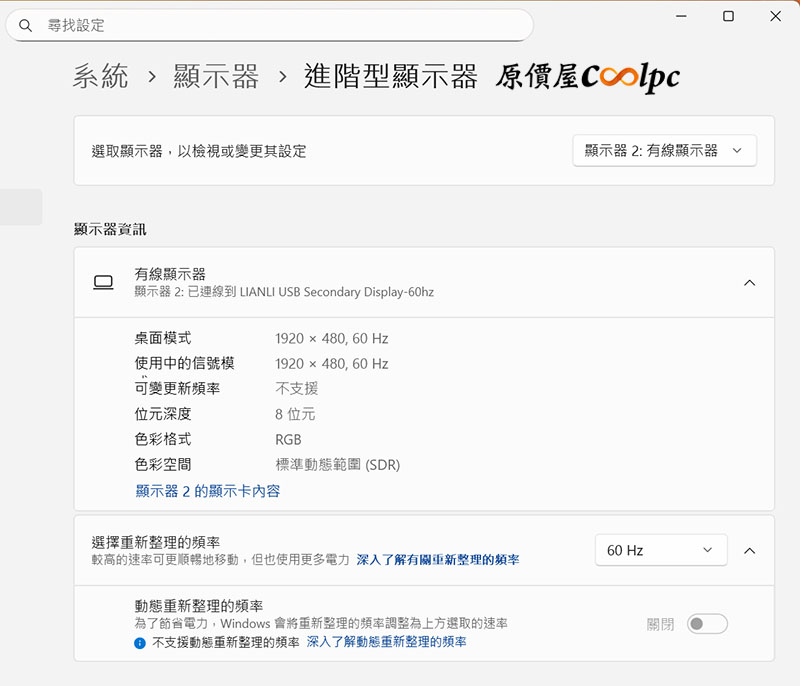 轉換成副螢幕後,可在 Windows 11 設定的顯示器中查看詳細資訊,偵測的設備名稱為 LIANLI USB Secondary Display-60Hz。