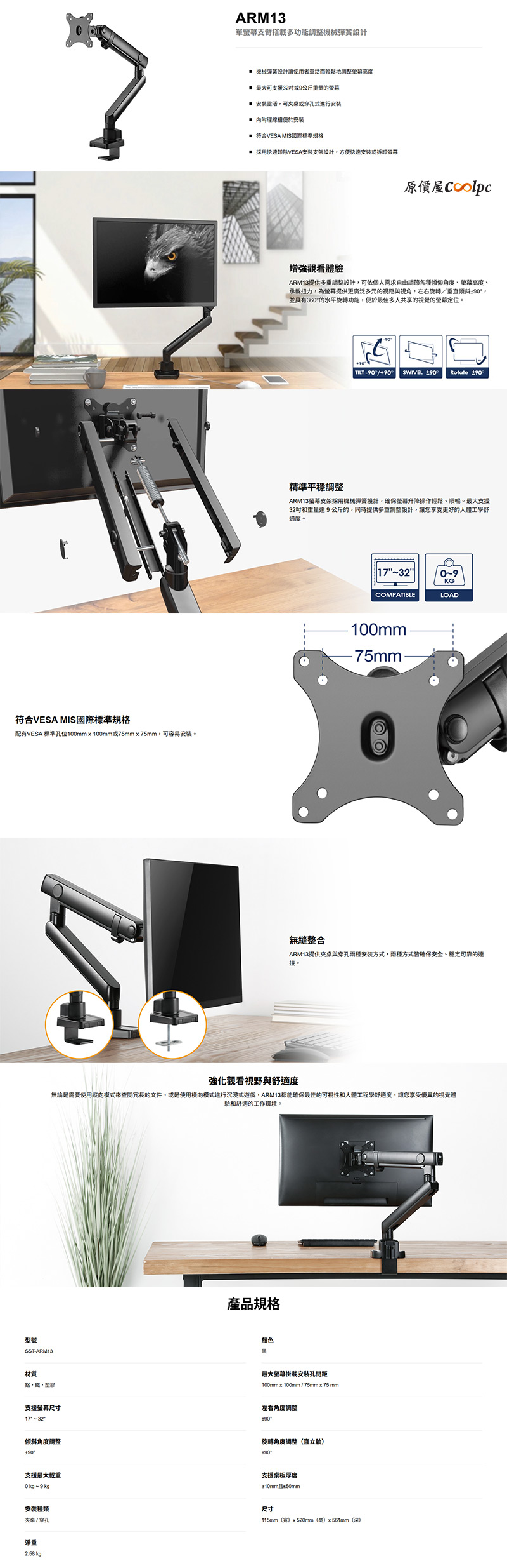 稍微好一點的螢幕通常原廠支架都能簡單調整,但是和銀欣SST-ARM13、SST-ARM14、SST-ARM14B這類螢幕支架相比,可調範圍和零活度還是有不小的差距。拿銀欣SST-ARM13來說,提供多重調整可以左右旋轉&垂直傾斜±90°,或是360°水平旋轉,輕鬆找到最適合自己的觀看位置,與他人共享畫面也更方便,機械彈簧設計最大還能支援32吋或是9公斤重的螢幕。至於銀欣SST-ARM14、SST-ARM14B兩款差在顏色,可以左右旋轉±90°、垂直傾斜-20°/+50°、直立軸旋轉±180°,氣壓式設計最大支援49吋或是20公斤的螢幕,比較偏向大尺寸顯示器專用的支架。而SST-ARM13和SST-ARM14系列都是穿桌、夾桌兩用設計,堅固的鋁金屬材質製作,配有VESA標準100x100mm、75x75mm安裝孔位,也安排理線槽便於安裝。除了改變螢幕的使用方式,也讓桌面空間跟著被釋放,更減輕了大家身體的負擔,簡單的升級就有一大堆好處啦。