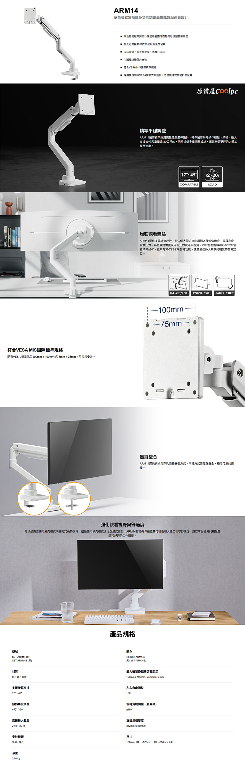 銀欣 SST-ARM14 單螢幕多功能支架【白色】$2990↘$1599