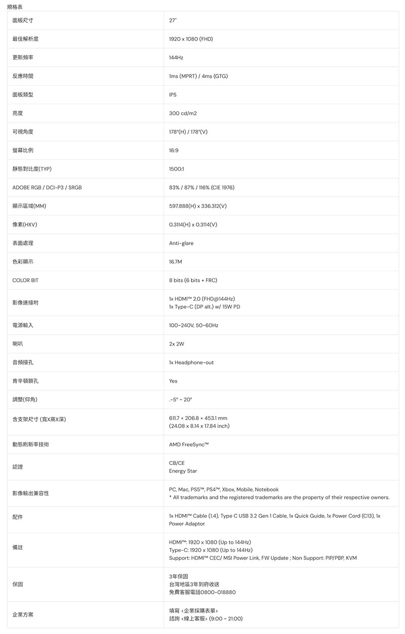 三千有找竟然有 Type-C!這台螢幕在同級規格中簡直沒有對手。27 吋大畫面、FHD、144Hz 更新率再加上內建喇叭,文書、遊戲一機搞定!最厲害的是它的擴充性,透過背後的 VESA 壁掛孔掛上小主機,一秒變身 AIO 一體機,支援 MSI Power Link 技術,一個按鈕就能同步開啟主機(主機需支援 HDMI CEC功能 )與螢幕,省時又省事!既然要長時間使用,護眼當然不能馬虎,內建 MSI Eye Care 減藍光+防閃爍+防眩光三重護眼技術,保護靈魂之窗,這 CP 值真的沒話說!