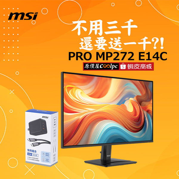 活動內容:MSI PRO MP272 E14C〈1H1C/IPS/144Hz/含喇叭/Type-C連接埠〉獨家款, $2988 ↘ $2888