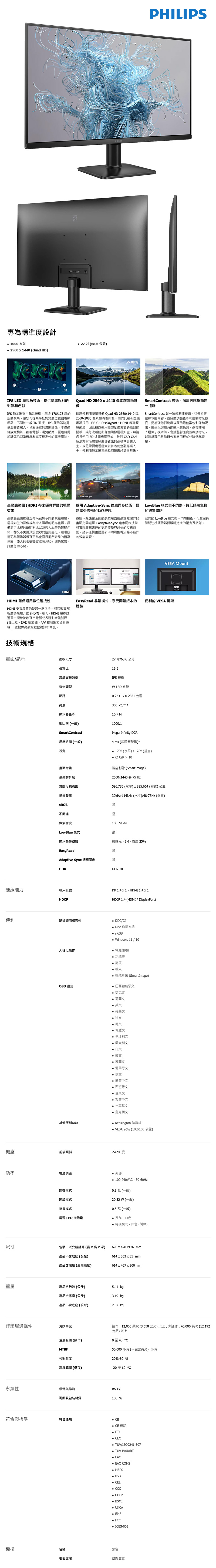 我們敢保證,你在外面找不到比它更便宜的2K螢幕,這台PHILIPS 27E2N1500L在原價屋只賣$2988元,絕對是市場最低價!你還在等什麼呢? 趕緊到原價屋買起來,數量有限售完為止喔。而且便宜歸便宜,PHILIPS 27E2N1500螢幕還是相當有水準,27吋搭配2K QHD(2560 x 1440)解析度,畫質細膩又清晰,無論辦公或娛樂都更舒適。並採用IPS廣視角面板,顏色精準畫面不失真,帶來絕佳色彩體驗,還支援HDR10呈現更深邃的黑與更明亮的白,畫面層次更豐富逼真,加上PHILIPS獨家SmartContrast技術強化暗部細節。螢幕同時也搭載低藍光不閃爍護眼技術,長時間觀看也不易疲勞,為你的視力健康把關!或是搭配VESA 100x100mm的人體工學螢幕支架,使用上更靈活且不佔桌面空間。I/O提供HDMI(v1.4)、DisplayPort(v1.4),輕鬆連接電腦或各種影音訊號源使用。