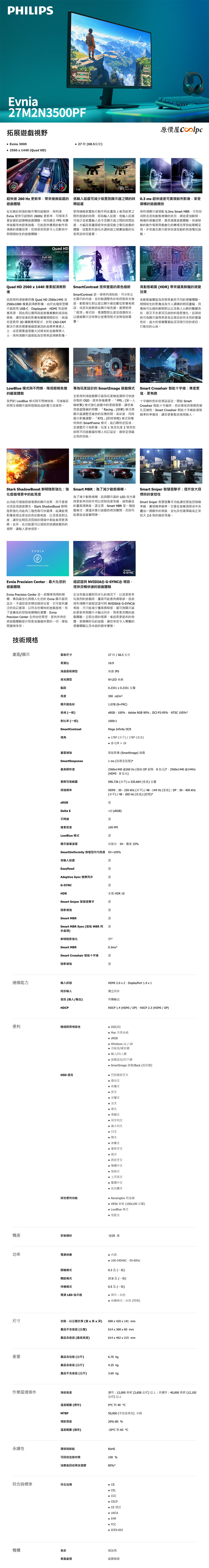 在電競的世界裡,你是否總有著「高性能等於高價位」的既定印象? 今天PHILIPS EVNIA 27M2N3500PF電競螢幕將會打破這層框架!有著適合遊戲的27吋畫面、清晰的2K QHD(2560 x 1440)影像、260Hz高刷新率、1ms(GTG)反應時間,並相容NVIDIA G-SYNC減少畫面撕裂。加上10.7億色彩深度(8+FRC),100% sRGB/95% DCI-P3/Adobe RGB 90%廣色域,還支援HDR 10帶來更鮮豔逼真的視覺效果,LowBlue低藍光技術也沒少。遊戲時有專為玩家設計的SmartImage模式,提供FPS、Racing、RTS多種精密校調的顯示模式,Smart Crosshair智能準心,Smart Sniper放大局部目標,Smart MBR減少動態模糊,SmartContrast強化對比,Stark ShadowBoost強化暗部能見度等。I/O配置2x HDMI 2.0、1x DisplayPort 1.4、1x耳機輸出孔,螢幕能夠-5°~+20°前後傾斜,或是搭配VESA 100x100mm規格支架使用。
