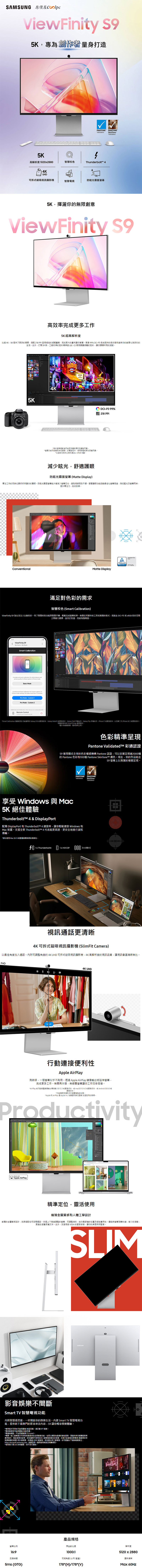 SAMSUNG ViewFinity S9 S27C900PAC 這台 27 吋螢幕具備非常稀有的 5K (5120 x 2880) 高解析度與 218 PPI 畫素密度,搭配 99% DCI-P3 廣色域與 Pantone 色彩認證,畫面細節更鮮明銳利、色彩精準到位,更厲害的是它支援智慧校色功能,只需透過智慧型手機搭配 SmartThings App,不需昂貴儀器即可輕鬆完成專業級色彩校準。螢幕還有可升降、傾斜與 90 度垂直翻轉超彈性的人體工學設計,滿足各種觀賞視野。內建強大的 Thunderbolt 4 連接埠支援高達 40Gbps 傳輸與 90W 筆電快充,一線就能搞定影像與電源,加上 mini DP 和 3 組 USB-C 連接埠,完美應對各式裝置,還有附贈 4K 可拆磁吸式攝影機,讓視訊會議無比清晰。此外之外,它更是您的專屬娛樂中心!內建 Smart TV 智慧電視功能,只要連上 Wi-Fi 即可免開電腦,就能看 Netflix、YouTube 等熱門串流影音,讓您一鍵切換至放鬆的追劇時光。工作與影音娛樂一次到位!