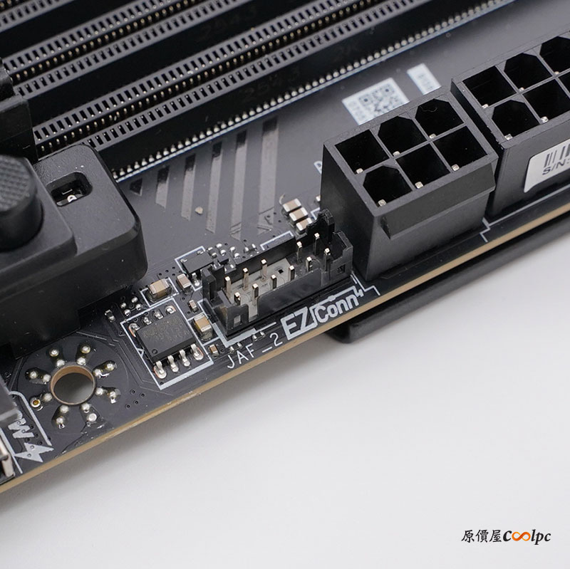 記憶體提供四個 DDR5 插槽,支援雙通道技術,最大可安裝 256GB 容量。插槽旁邊還有數位除錯顯示器和 LED 指示燈;6 Pin 下方 EZ Conn 插槽,可以讓你接MSI EZ 系列風扇(7 pin)或MSI 一體式水冷(11 pin),沒有限定產品也沒關係,有附上 1 對3 EZ Conn 線材,可連接ARGB 燈、系統風扇和 USB 裝置。