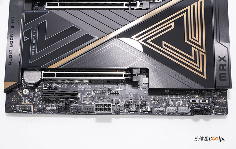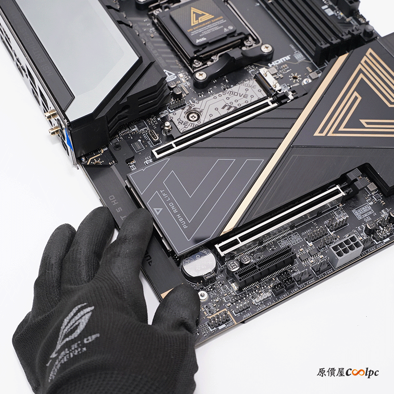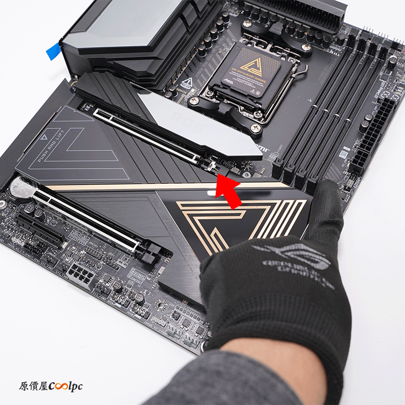 主機板有三個 PCIe 5.0 SLOT 插槽,從上而下分別為 PCIe 5.0 x16、 PCIe 5.0 x8、 PCIe 5.0 x4,唯有 Ryzen 8700/ 8600/ 8400 Series 處理器會跑 PCIe 4.0,主要的 PCIe 5.0 x16 介面還有免螺絲快拆,一顆按鈕即可輕鬆拆裝顯卡。