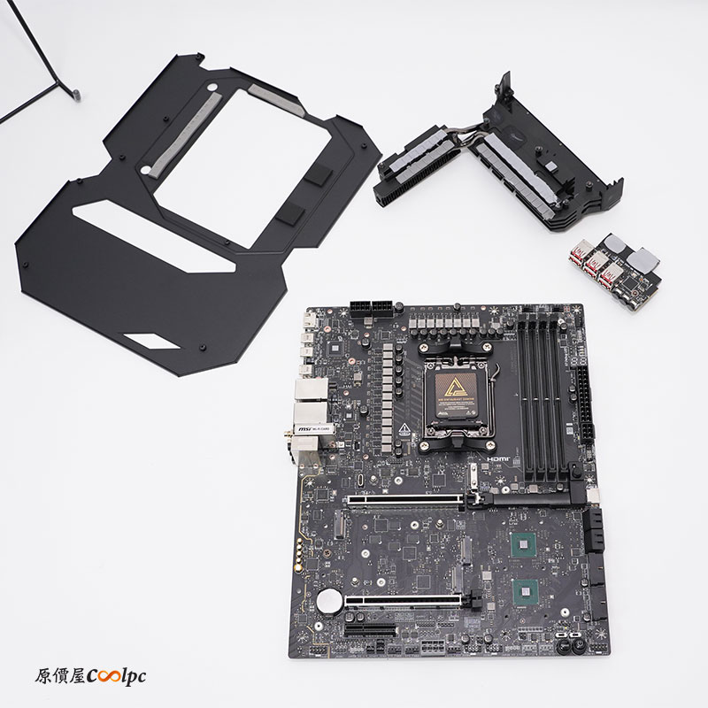 散熱片與底下皆有雙層導熱膠,紅色框框的 SLOT 為 PCIe 5.0 通道,藍色與背後皆為 PCIe 4.0,使用 Ryzen 8000 Series 處理器通通都會變成 PCIe 4.0。