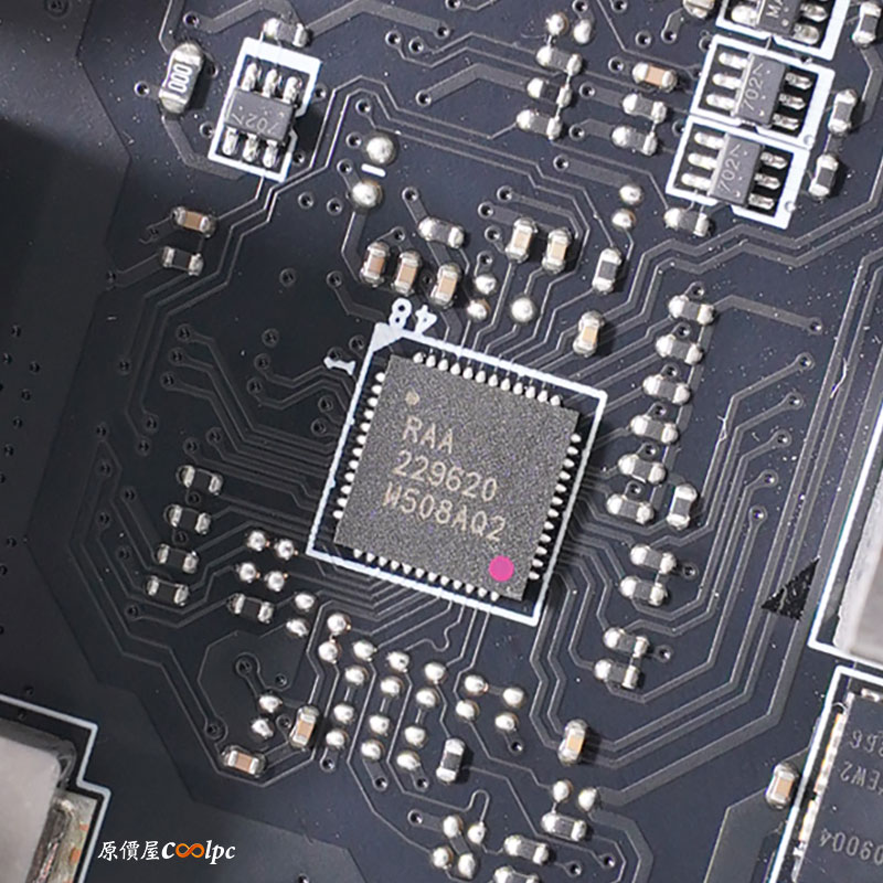 (點圖放大) 緊接著來看看主機板內部用料囉!拆開波浪式鰭片與直觸式交叉熱導管 散熱模組,後 I/O USB 介面採用模組化設計,主機板採 18(110A)+2+1 數位供電相數設計,電供主控晶片為 Renesas Electronics RAA229620,MOSFET 為 R2209004 SPS 和一顆 AOZ5516QI 與 RT3672EE 主控,HDMI 中繼晶片 Realtek RTD2151,USB4 晶片 ASM4242,USB4 提供 PD 充電晶片 IT8857FN,Type-C 晶片正反兩顆 ASM1543,10GbE 有線網路晶片 Marvell AQC113,5GbE 有線網路晶片 Realtek RTL8126,PCIe 5.0 訊號中繼晶片 Phison PS7101,音效晶片 Realtek ALC4082 Codec 和 ES9219Q DAC,雙 AMD X870E 晶片,環控晶片 NCT6687D,WI-Fi 7 + 藍芽 5.3 傳輸晶片為 MTK MT 7927。
