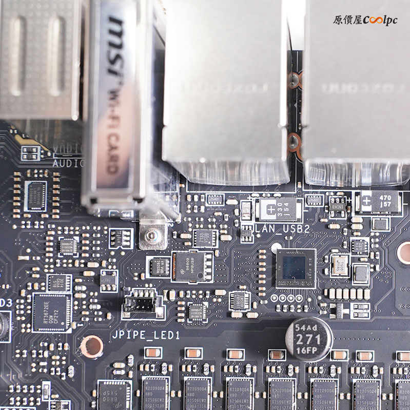 旁邊主機板的 24 Pin也是實心針腳設計,下面 6 Pin 是給前置 USB Port 提供 27W 供電,透過自家 MSI Center 軟體還能即時監控 USB 的輸出功率、電壓和電流。