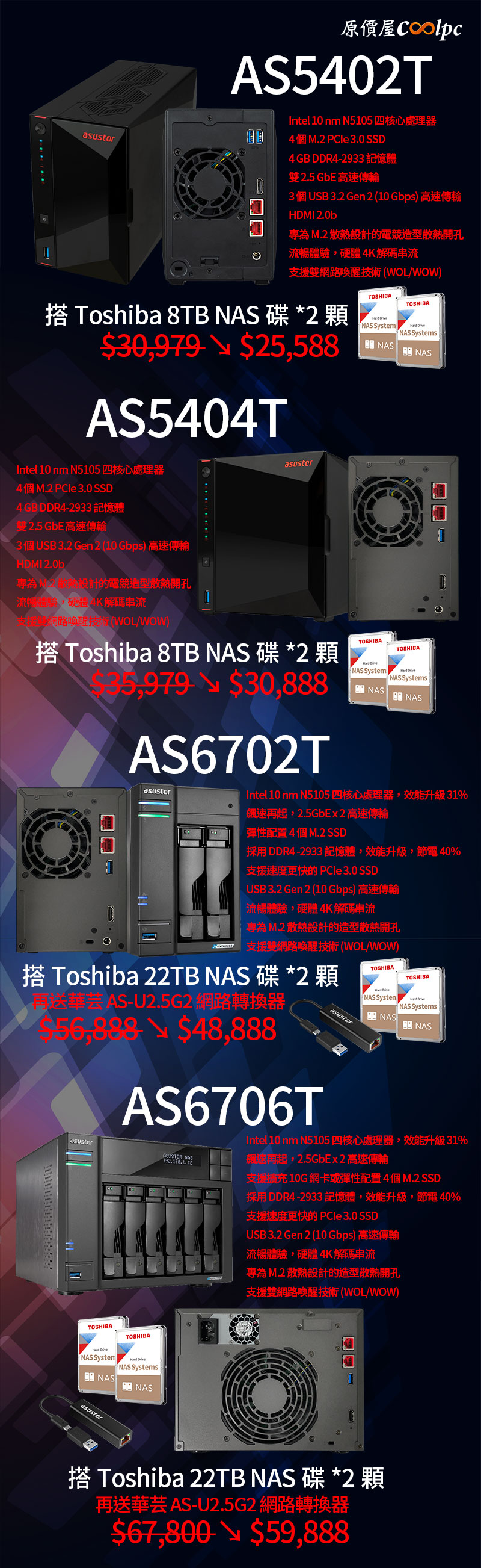 華芸 AS5404T 搭【Toshiba 8TB NAS碟*2顆】, $35,979 ↘ $30,888 限量 8 組