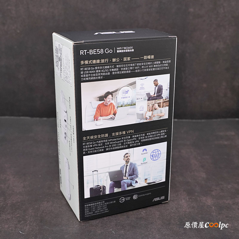 這台華碩 RT-BE58 Go 雙頻 WiFi 7 體積雖小但五臟俱全,提供公共 WiFi (WISP) 模式,支援 4G 和 5G 行動網路分享,適合出門在外旅行、行動餐車、參展等環境,透過 MLO 和 4K-QAM,雙頻 WiFi 7 速度高達 3600 Mbps,還有商業級 AiProtection 提供全天候的點對點防護和多達 30 家服務供應商全方位 VPN 功能,讓你有安全私密的網路存取,本身還能透過 USB-C 18W PD行動電源供電給路由器,出門在外網路不中斷。可透過 Guest Network Pro 輕鬆設定 IoT 裝置、VPN 子網路或訪客入口網站,方便你管理使用情境,側面還有一顆快捷按鈕,讓你快速切換不同的網路設定,非常便利,售價的部分華碩 RT-BE58 Go $2599 元含稅,歡迎有興趣的朋友可以利用網路下單,或到門市做詢問,或利用蝦皮商城下單囉。
