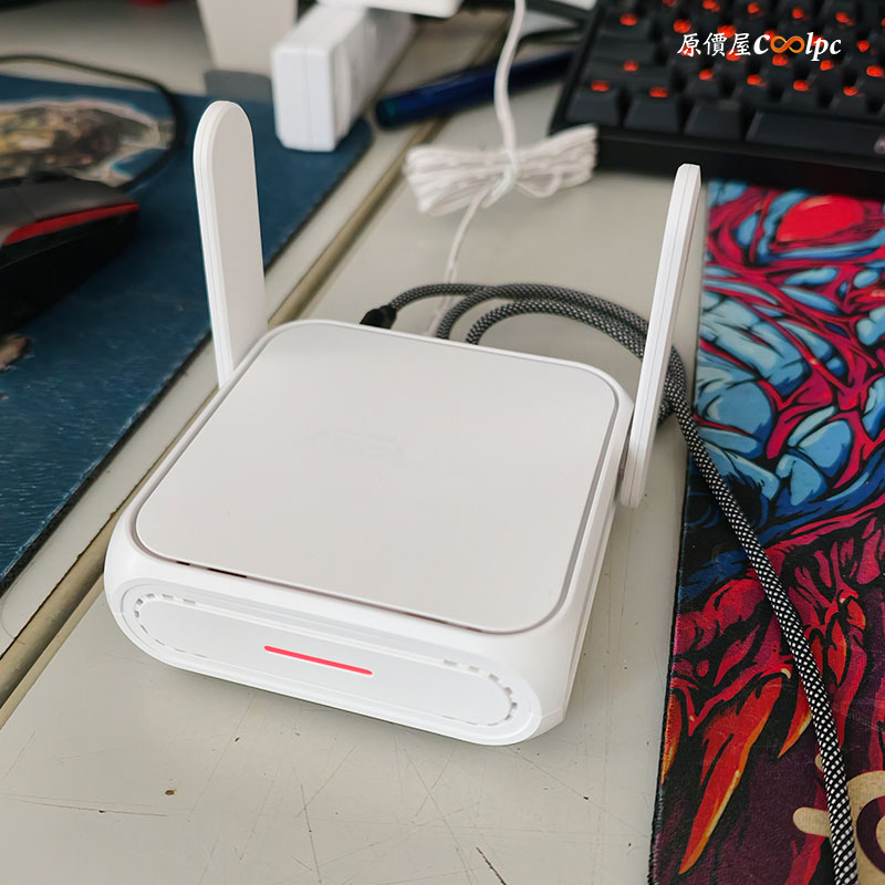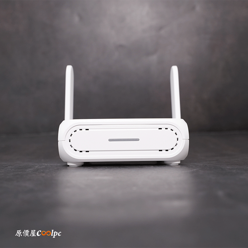 尺寸為 99 x 111 x 36mm,一手可掌握的方形無線基地台,搭載 90 度可收折雙天線,旁邊有一顆快捷切換功能按鍵,可以輕鬆更改不同的網路設定,背面還有兩個網路插孔,一個 WAN 和 LAN 以及一個 USB 3.0 (支援 WAN 功能)介面,還有兩個壁掛孔,最特別的是供電採用 USB-C 介面,讓你出外也可以用 PD 行動電源供電給基地台,還能直接透過 USB 網路共享功能,將手機 4G LTE/5G 行動網路分享到路由器,短暫解決 WAN 網路中斷的時刻。