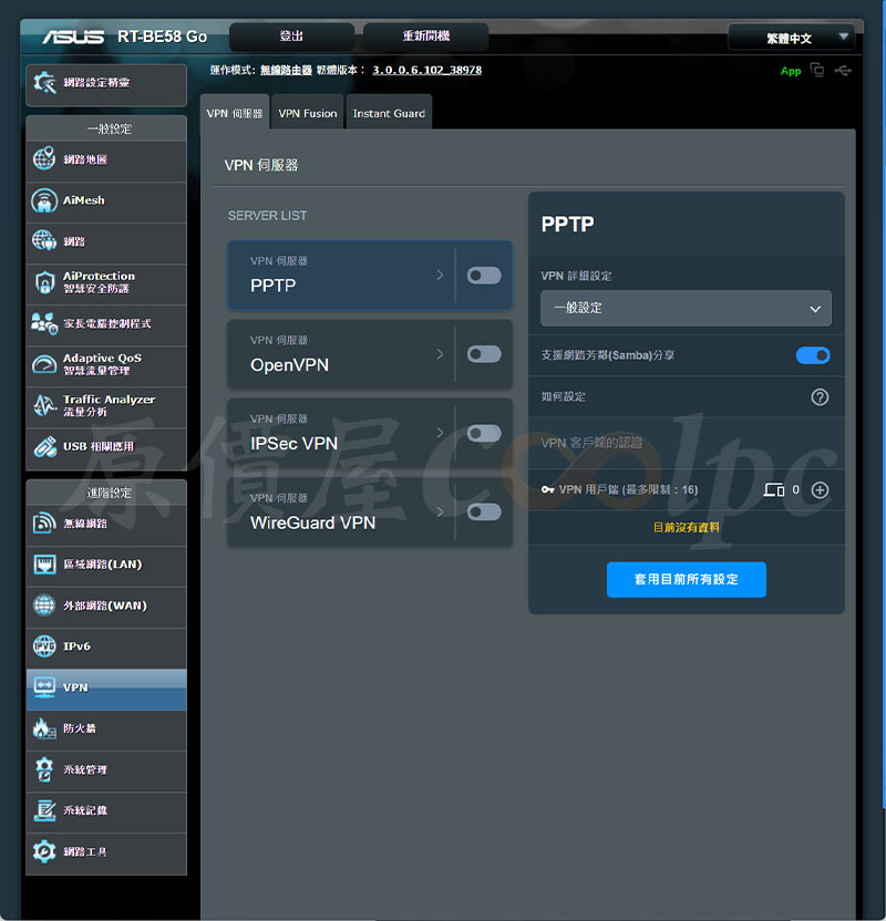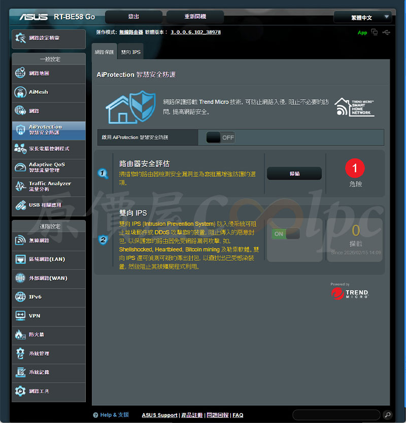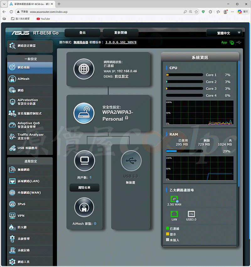 初始網路設定之後,還有許多豐富的設定可以自由調整,一般設定有有網路地圖、AiMesh、網路、AiProtection 智慧安全防護、家長電腦控制程式、Adaptive Qos 智慧流量管理、Traffic Analyzer 流量分析、USB 相關應用。進階設定有無線網路、區域網路(LAN)、外部網路(WAN)、IPv6、VPN、防火牆、系統管理、系統紀錄、網路工具。