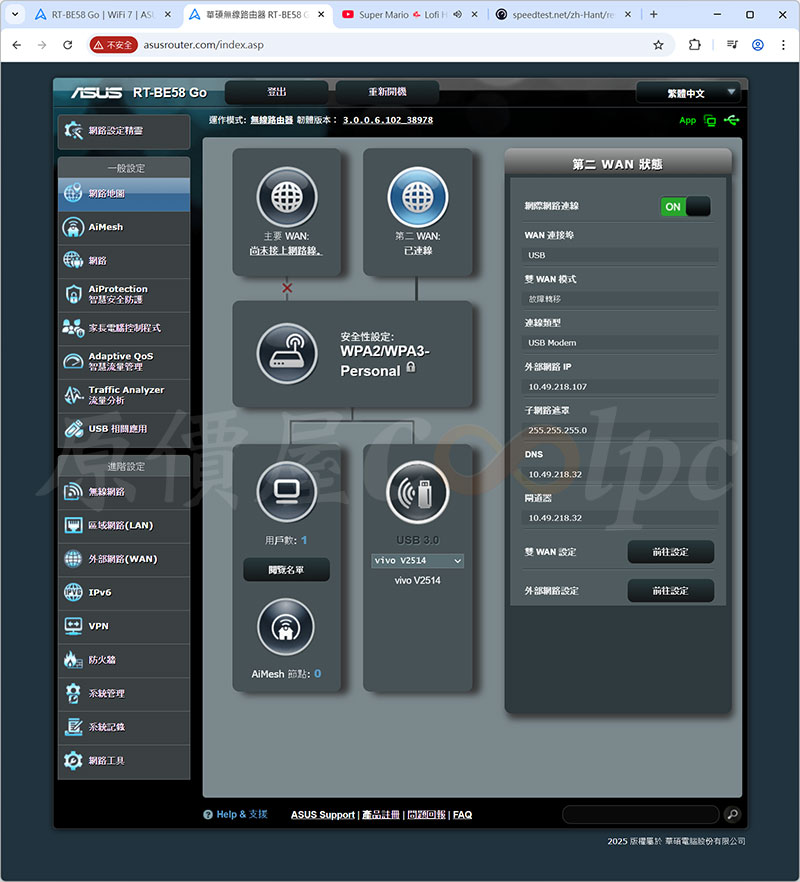 使用一台電腦確認有沒有正常連網,上方顯示第二個 WAN 已連線。