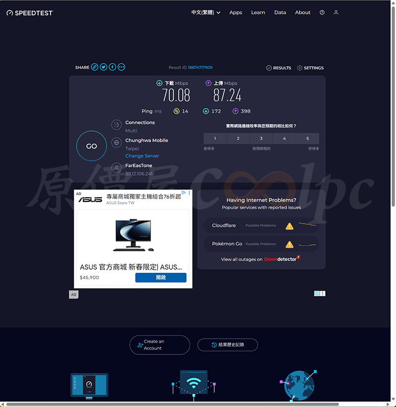 透過 SPEEDTEST 測速,手機網路共享正常。