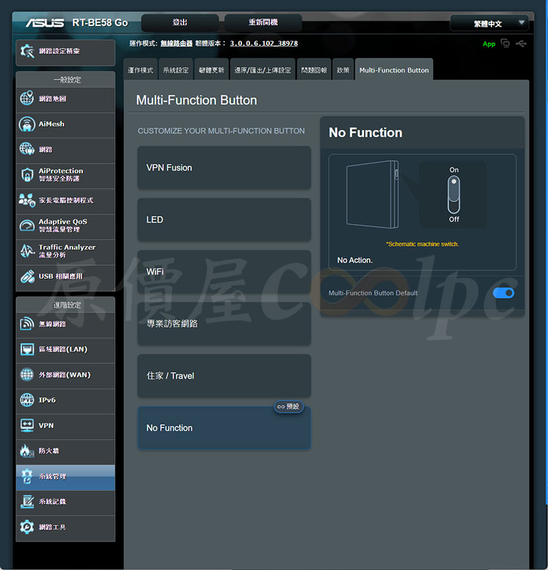 剛剛有提到機身邊有一個快捷鍵,要使用的話要到系統管理,最後面 Multi-Function Button 選項,預設是沒有功能,可以設定 VPN Fusion、LED、WiFi、專業訪客網路、住家/Travel。