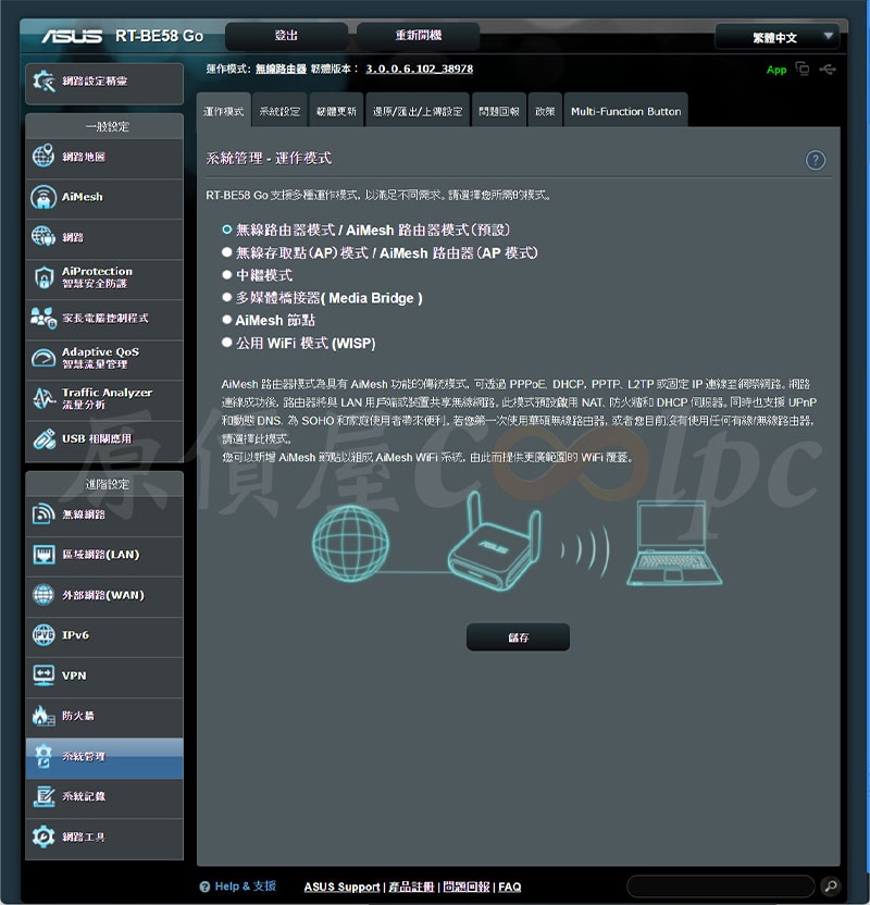 提供多種運作模式,無線路由器模式/ AiMesh路由器模式、無線存取點(AP)模式/ AiMesh 路由器(AP模式)、中繼模式、多媒體橋接器(Media Bridge)、AiMesh 節點、公用 WiFi 模式(WISP)。