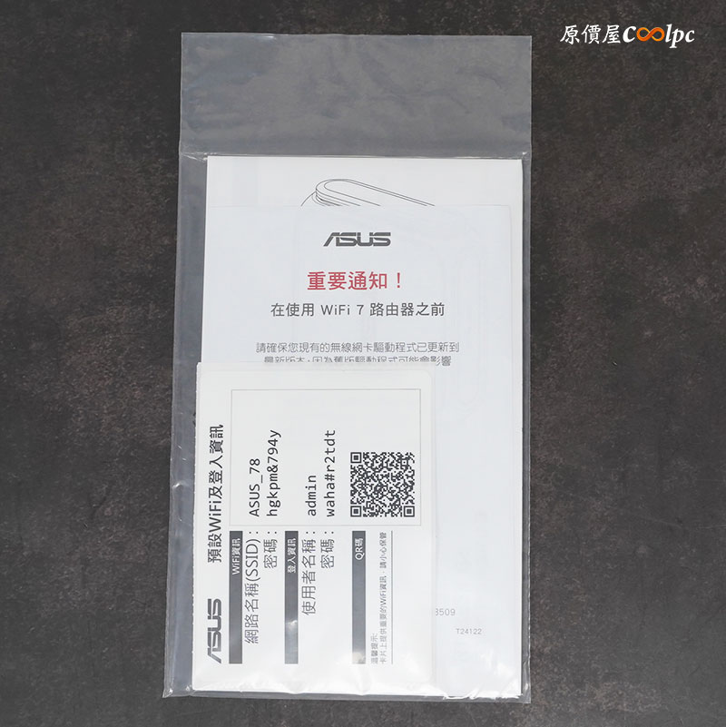內容物有變壓器、扁式網路線、RT-BE58 Go 分享器本體;變壓器支援國際通用電壓 100-240V(50/60Hz),輸出 12V 2000mA,內附的網路線只有一米長度,另外使用手冊還有提供一組,預設 WiFi以及登入資訊,這資訊機身背後也會有,以防萬一的話可以拍照起來放在手機。