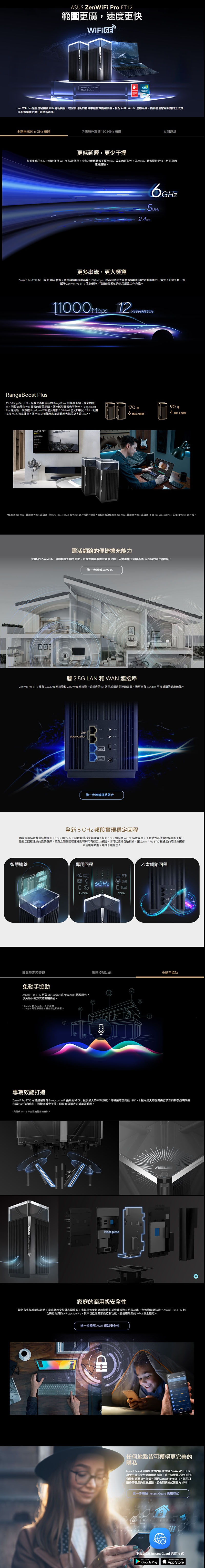ASUS ZenWiFi Pro ET12 旗艦級 Wi-Fi 6E Mesh 系統,使用 tri-band 三頻設計(2.4GHz/1148Mbps/4×4 + 5GHz/4804Mbps/4×4 + 6GHz/4804Mbps/4×4),總速高達 11,000 Mbps,12 個數據流可應付多個裝置同時上網。內建 8 根天線並提供干擾更低的 6GHz 頻段,低延遲讓你面對即時戰略遊戲,雲端遊戲串流服務不卡頓,妥妥的純享受!家裡太大,一顆不夠就買兩顆,AiMesh 技術讓你輕擴充節點(支援有線/無線回程/6GHz 專用回程)。I/O 提供 2.5G WAN + 2.5G LAN + 2 x GbE LAN,GbE 支援鏈路聚合。安全方面提供 WPA3 安全加密協定 + 終身免費 AiProtection Pro,還有家長控制功能,一家大小使用真安心!在外面你也能用 Instant Guard VPN,讓你出門在外,也像在家一樣安全上網。