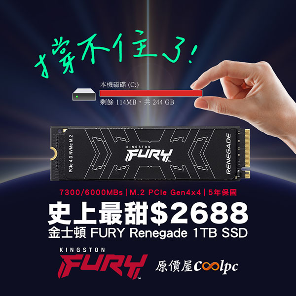 滿了就要升!金士頓 FURY Renegade 1TB 只要 NT$2688。