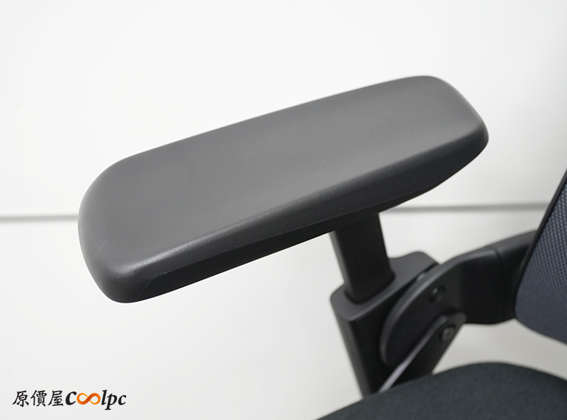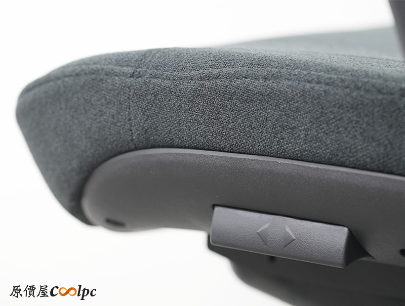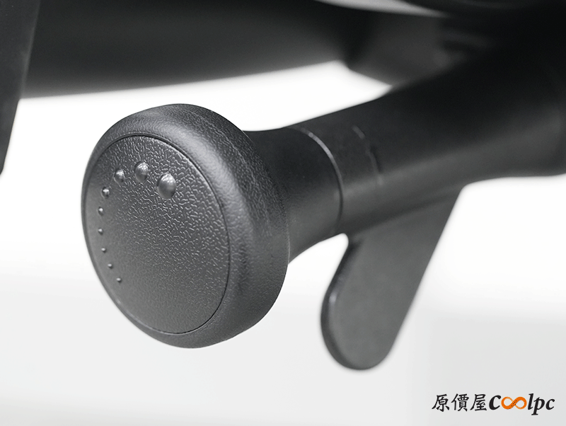 左右扶手也是符合人體工學,扶手表面左右高起,更貼近手臂的形狀,而且調整高低的按鈕在下方,這點倒是挺特別。